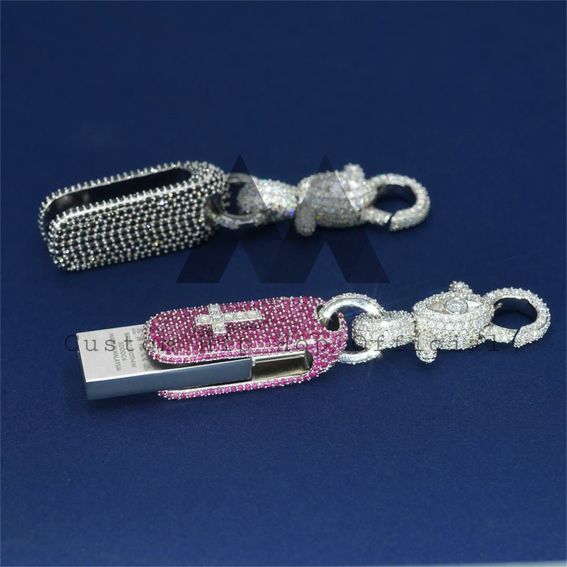 Elevate your style with this Sterling Silver Moissanite USB Flash Drive Pendant, a fusion of hip hop jewelry and tech. Flaunting VVS Moissanite and WHITE GOLD plating, it’s designed to dazzle on a 4MM Tennis Chain. Comes with a certificate and gift box, ready to impress.